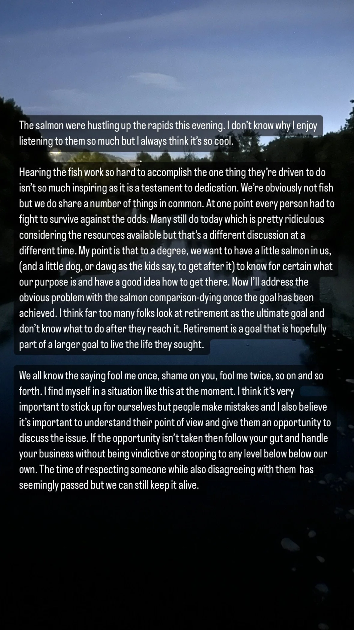 Hearing the fish work so hard to accomplish the one thing they're driven to do isn't so much inspiring as it is a testament to dedication. We're obviously not fish but we do share a number of things in common. At one point every person had to fight to survive against the odds. Many still do today which is pretty ridiculous considering the resources available but that's a different discussion at a different time. My point is that to a degree, we want to have a little salmon in us, (and a little dog, or dawg as the kids say, to get after it) to know for certain what our purpose is and have a good idea how to get there. Now I'll address the obvious problem with the salmon comparison-dying once the goal has been achieved. I think far too many folks look at retirement as the ultimate goal and don't know what to do after they reach it. Retirement is a goal that is hopefully part of a larger goal to live the life they sought.